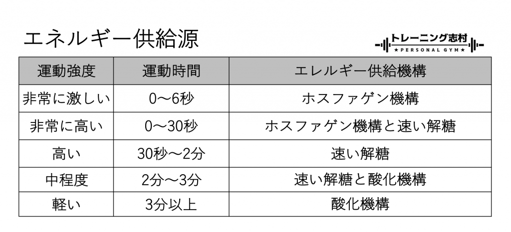 エネルギー供給源は大きく分けて3つ(①ホスファゲン機構 ②解糖系 ③酸化機構)あります。