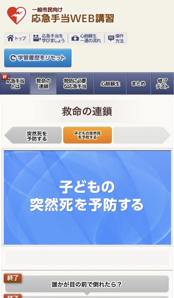 消防庁の応急手当web講習は下記のリンクより誰でも受講できます。動画を見て問題に答える形式となっております。時間は約30分程度でした。