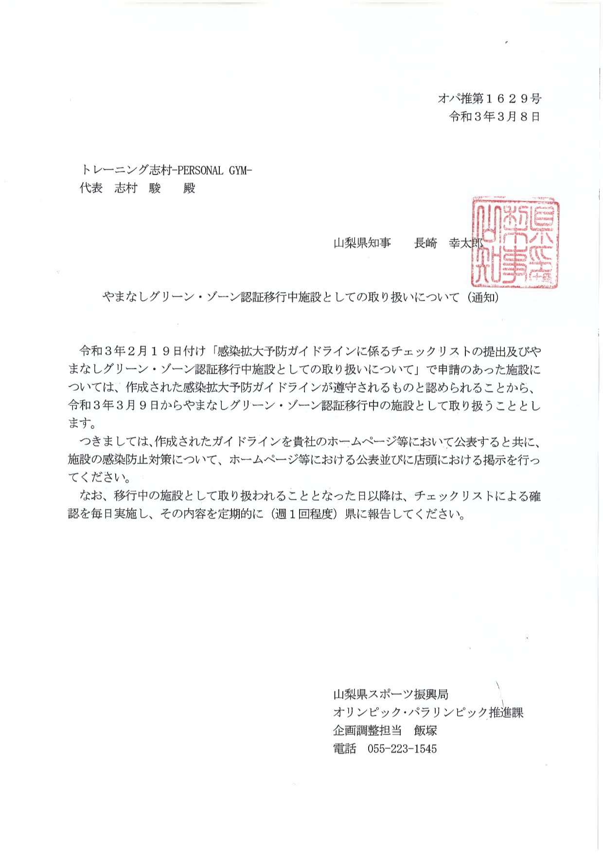やまなしグリーン・ゾーン認証移行中施設として承認されました