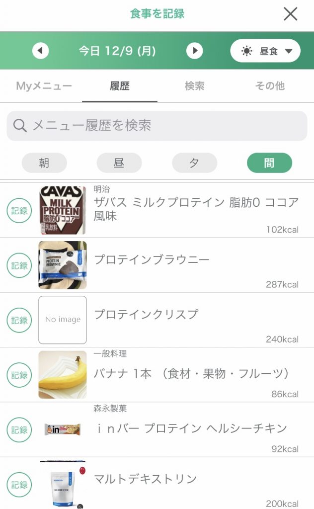 一度登録した食事は履歴に残るので次回以降は簡単に登録することができます。